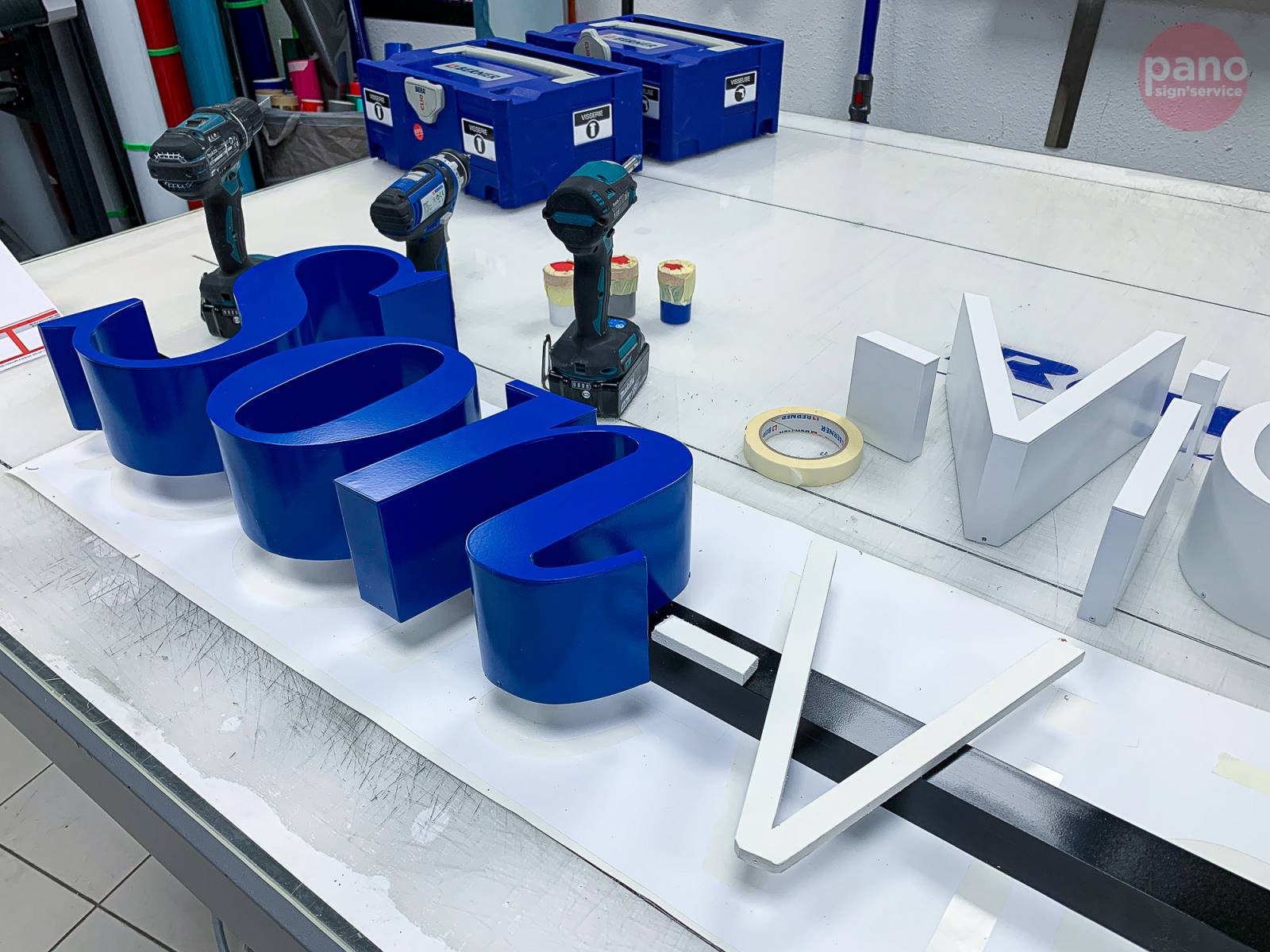 Le bâtiment étant dans une zone protégée, il n’était pas possible de faire des travaux trop importants en façade. Notre équipe a opté pour poser toutes les lettres boitier en plexiglas sur des lisses peintes au RAL des vitrines afin de garder une certaine discrétion. La base de ces lettres reliefs, aussi appelées lettres 3D, est un PVC qui permet d’y placer des LED qui ainsi enfermées dans le boitier plexiglas donnent des lettres lumineuses indépendantes.