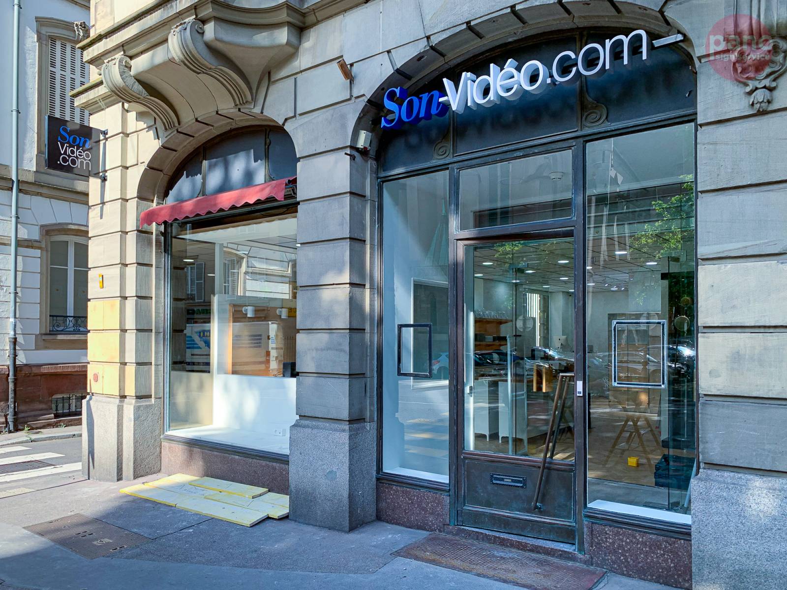 Enseigne en lettres reliefs plexiglas fixée sur lisse avec son enseigne drapeau double face pour Son & Vidéo à Strasbourg