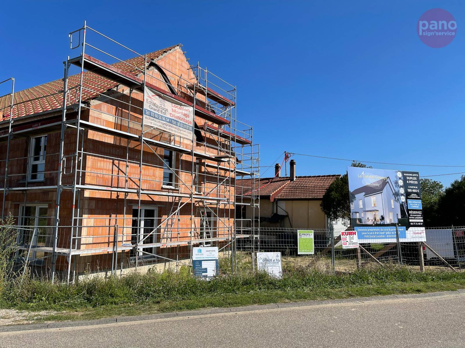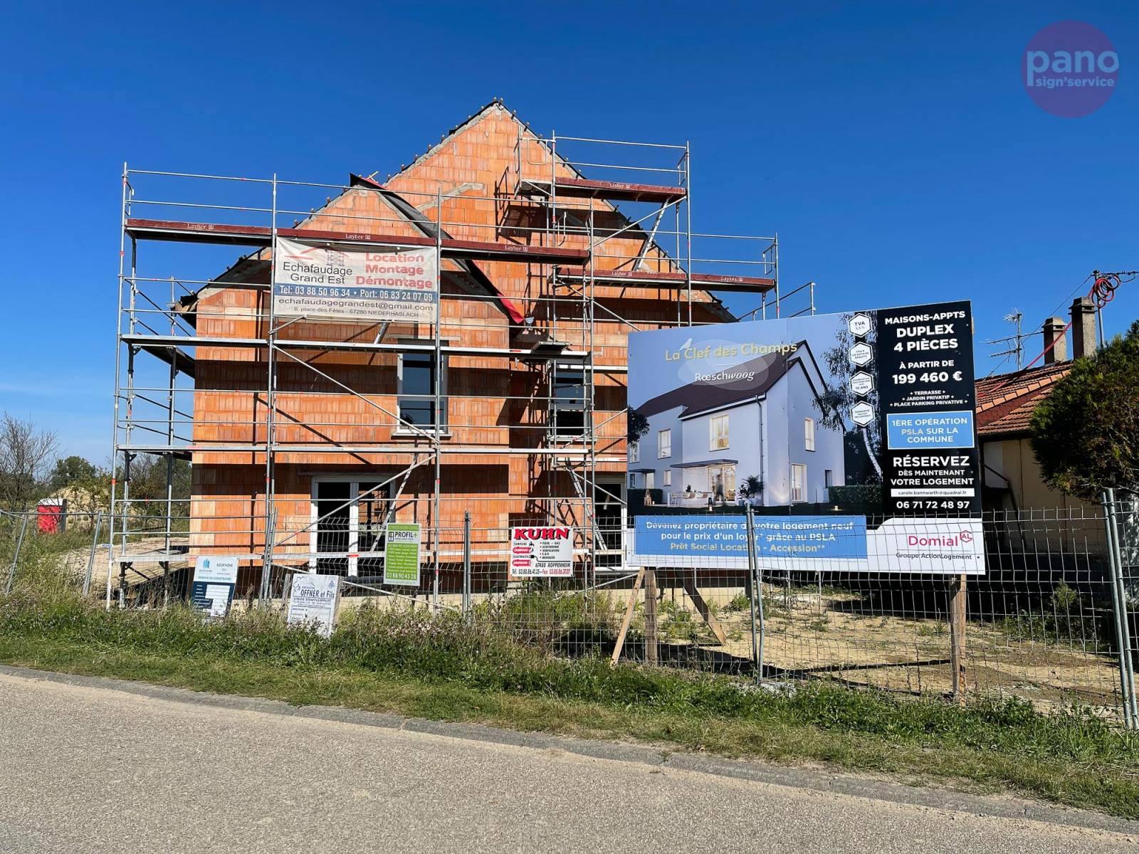 Le groupe Domial souhaitait faire une communication innovante sur la construction d'un de ses bâtiments. Nous avons donc réalisé un panneau immobilier 4x3 que nous avons installé pour le groupe Domial près de Strasbourg (Rœschwoog). Cette pièce était nécessaire pour annoncer un projet immobilier à venir. L’installation de ce panneau publicitaire permet de promouvoir les entreprises de notre belle région.