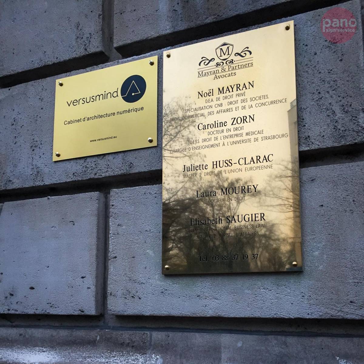 Production et pose d’une plaque professionnelle gravure mécanique noire et fond aluminium or pour Versusmind société située à Strasbourg
