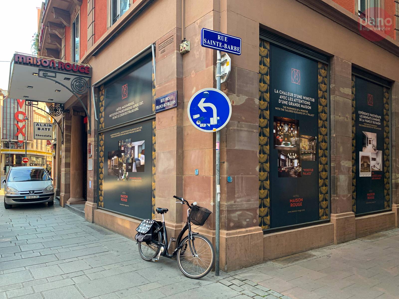 L’hôtel Maison Rouge avait besoin d’une communication visuelle rapide, éphémère et peu coûteuse permettant de cacher les travaux visibles des fenêtres. Notre équipe a reçu les fichiers graphiques du client, a produit - sur un vinyle résistant et s’enlevant facilement - et a posé dans un délai très court cette vitrophanie afin de communiquer sur la réouverture de l’Hôtel rénové. Cela permet de communiquer facilement de façon éphémère avec un rendu haut de gamme.